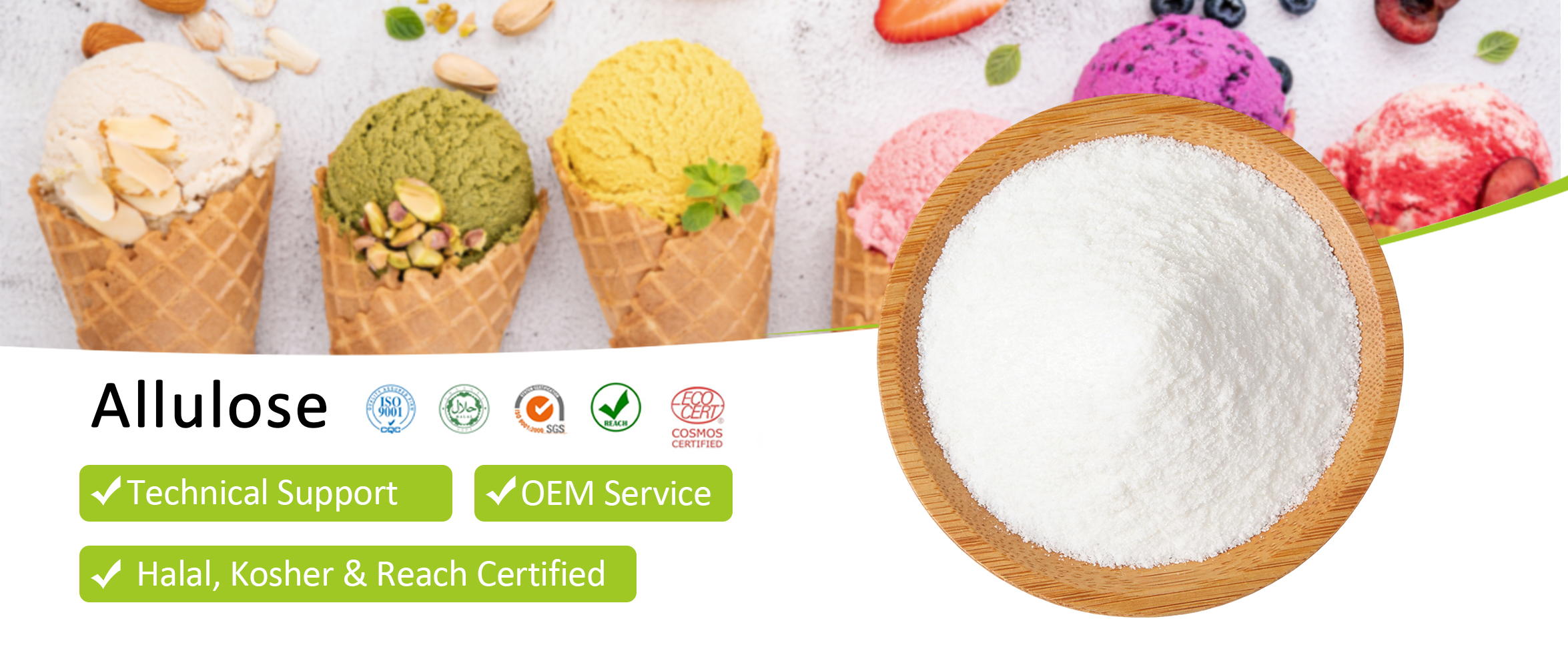 يستخدم مسحوق الأليلوز في تركيب الآيس كريم لأنه يمنع تكوين بلورات الثلج. وفي حالة التجميد، فإنه يخفض درجة تجمد المزيج، وبالتالي يمنع تكون البلورات الكبيرة. ونتيجة لذلك، يكون هناك ملمس ناعم وموحد يظل ثابتًا حتى بعد دورات التجميد المتعددة. في النهاية، يُترجم هذا أيضًا إلى مدة صلاحية ممتدة وملمس كريمي مع مرور الوقت.