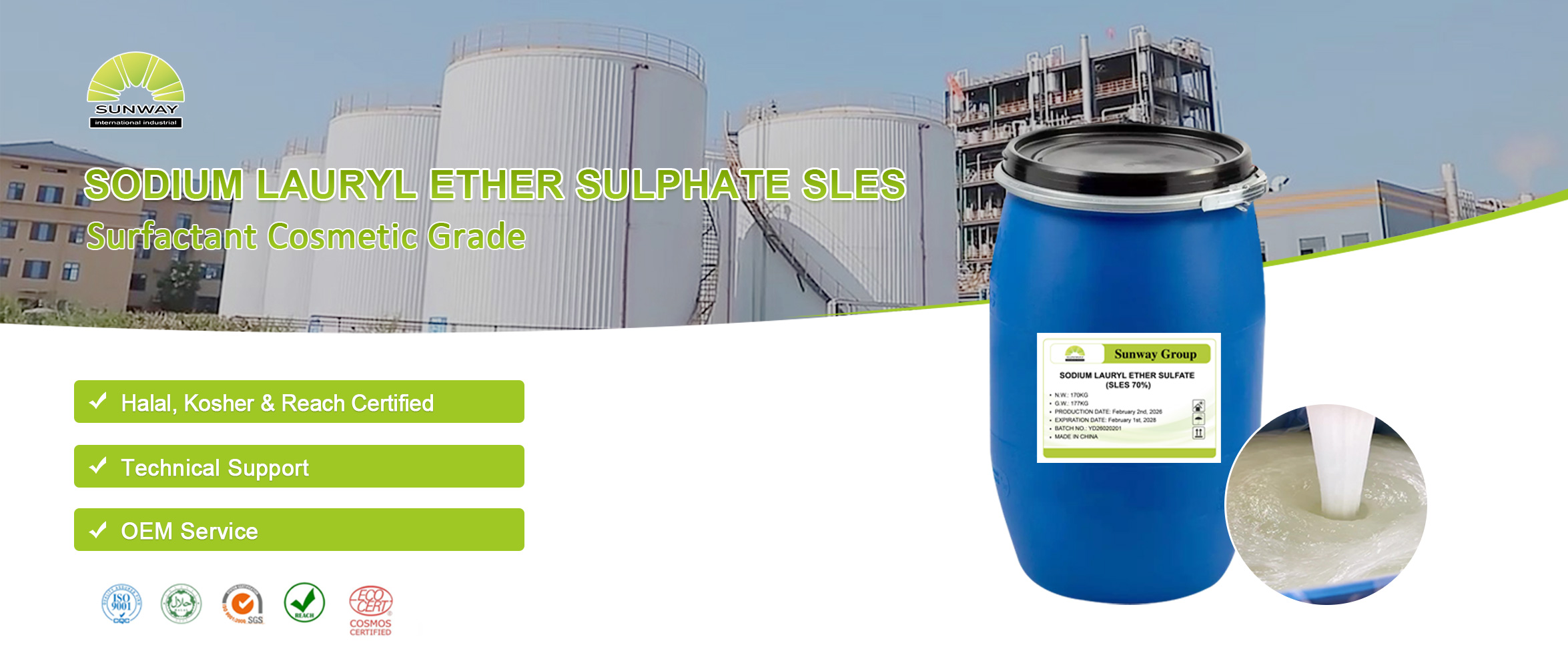 تفخر مجموعة Sunway Group بكل هذه الأمور. نحن هنا لنقدم لك أقل من الأفضل. لدينا رقابة صارمة على الجودة لتزويدك بـ SLES عالي الجودة بنسبة 70%. نحن نلتزم أيضًا بمعايير الصناعة الخاصة بالاستخدام الكيميائي والسلامة.
